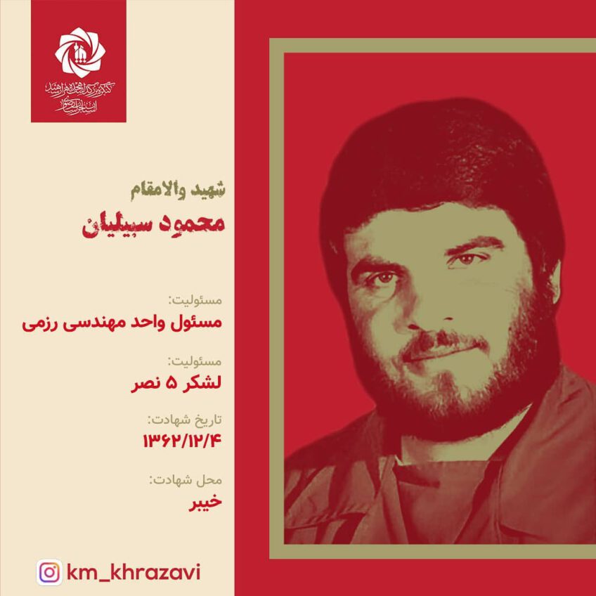 شهید سید محمود سبیلیانفرمانده واحد مهندسی رزمی لشگر ۵نصرتاریخ شهادت:1362/12/4.به نقل از دکتر بتول نصرتی (همسر شهید ) :سال 60 دیپلم گرفتم و وارد بسیج خواهران شدم. جنگ بود و همه دغدغه ما پاسداری از ارزشهای انقلاب اسلامی بود. آقای سبیلیان در سپاه و جها د و نهضت و انجمن اسلامیها و … همیشه در حال فعالیت بود. او برای همه الگوی کار برای انقلاب اسلامی بود. حاج آقا رضایی مسؤول بسیج خواهران و برادران بودند. یک روز آمدند و پیشنهاد ازدواج با آقا محمود را به من دادند. من به حاج آقا رضایی اعتماد داشتم، از خودشان نظر خواستم و به تأیید ایشان، خواستگاری …