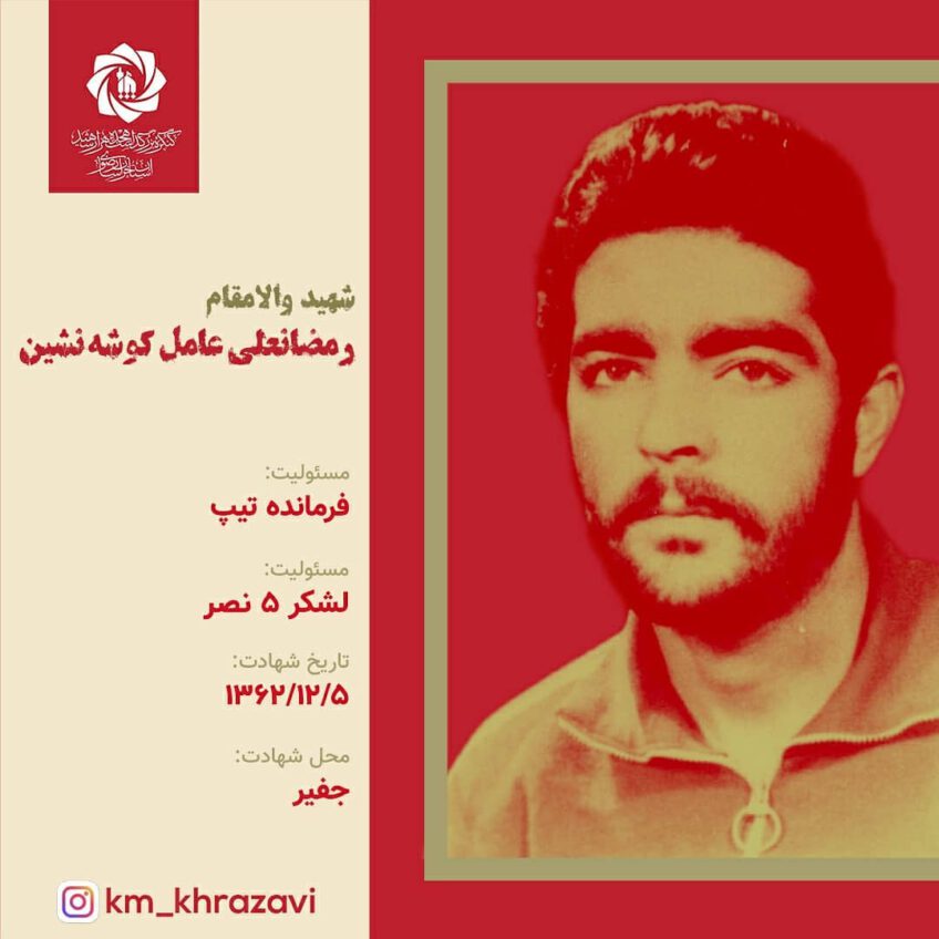 شهید رمضانعلی عامل کوشه نشینفرمانده تیپ امام صادق (ع)از لشکر 5 نصرتاریخ شهادت:1362/12/5.علیرضا مهرداد – یکى از دوستان شهید – در مورد چگونگى به شهادت رسیدن او مى گوید: «روز دوّم عملیّات خیبر در منطقه عملیّاتى هورالهویزه، دّه اى از کماندوهاى عراق دست به پاتک زدند و به طرف خط خودى در حال حرکت بودند که با شجاعت برادران بسیجى و با دلاورى فرماندهان، پاتک دفع شد و در آخر پاتک عدّه اى از مزدوران عراقىِ در حال فرار اقدام به تیراندازیهاى متفرّقه کردند. در یک لحظه که به پشت سرم نگاه مى کردم، شهید عامل را دیدم که با بى سیم چى در حال …