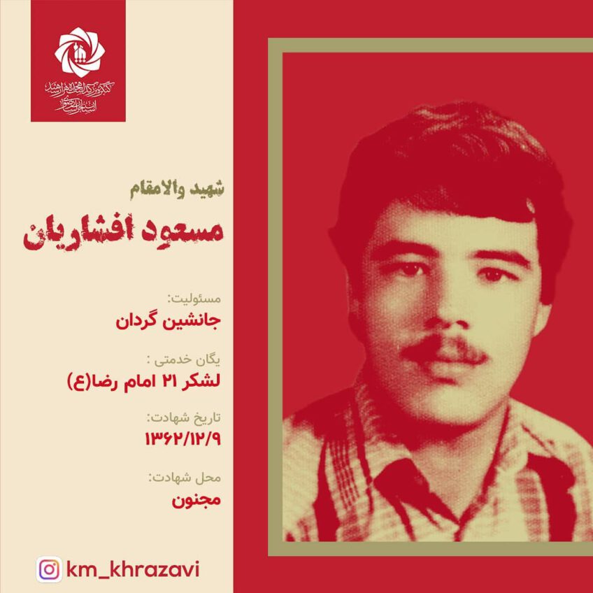 مسعود افشاریان شاندیزجانشین گردانتاریخ شهادت:1362/12/9.یکى از همرزمان شهید – به نام آقاى داوودفر – می گوید: «قبل از عملیات خیبر مسعود گفت: بچه ها شهید شدند، اما نحوه شهادت من طور دیگرى است. پرسیدم: بگو چطور است؟ اما مسعود گفت: تا وارد خاک عراق نشویم، نمی گویم چطور شهید می شوم. به هر حال به محض اینکه در عملیات خیبر وارد جزیره مجنون شدیم، نزدیک دجله و فرات به مسعود گفتم: حالا بگو نحوه شهادت شما چطور است؟ گفت: من خواب دیده ام از لحظه ورودم به عراق هفتاد و دو ساعت بعد شهید می شوم و حتى مسائل ریز شهادت را – اینکه تیر …
