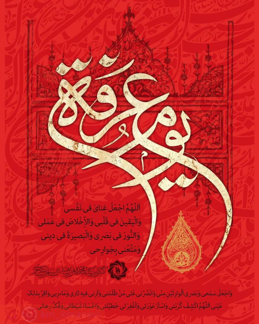 خدایا قرار ده، بی نیازی را در ذاتم، و یقین را در دلم، و اخلاص را در عملم، و نور را در دیده ام، و بصیرت را در دینم و مرا به اعضایم بهره مند کن، و گوش و چشمم را دو وارث من گردان، و مرا بر آن که به من ستم روا داشته پیروز فرما، و در رابطه با او انتقام و هدفم را نشانم ده، و چشمم را بدین سبب روشن گردان.خدایا گرفتاری ام را برطرف کن، و زشتی ام را بپوشان، و خطایم را بیامرز و شیطانم را بران و دینم را ادا کن،فرازی از دعای عرفه