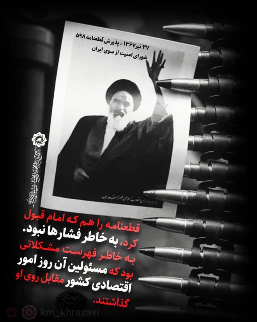 امام خمینی (ره): «قبول قطعنامه از طرف جمهوری اسلامی ایران به معنی حل مساله جنگ نیست. با اعلام این تصمیم، حربه تبلیغات جهانخواران علیه ما کند شده است البته ما رسماً اعلام می کنیم که هدف ما تاکتیک جدید در ادامه جنگ نیست قبول این مساله برای من از زهر کشنده تر است. ولی راضی به رضای خدایم و برای رضایت او این جرعه را نوشیدم تصمیم امروز فقط برای تشخیص مصلحت بود بدانید که پیروزی از آن شماست»